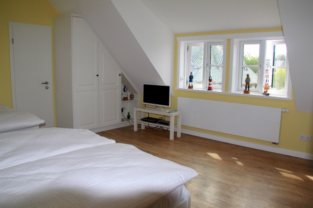 Dieses Schlafzimmer ist neben zwei 160x200 cm großen Boxspringbetten auch mit einem ca. 30 Zoll großen Flachbildfernseher ausgestattet